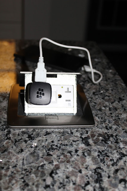 This is one of the two plug ins that were installed into the granite counter top. The small button in front is pushed in & the top of the outlet is pushed down, creating a flushed, brush nickel plate. One was needed to pass the electrical inspection & could not decide on which end of this 12 foot island to place one, so two were installed, one at each end. Only in New Brunswick does this ruling stand!