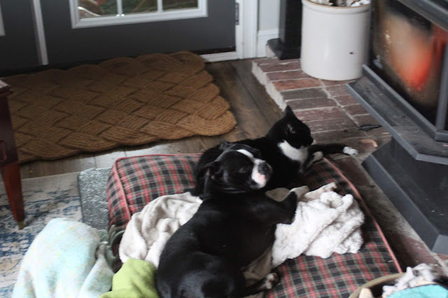 The two just ignored each other & settled in. It flooded so many memories of the love between Boris & Rexton several years back, when they use to spoon together in front of the firebox.