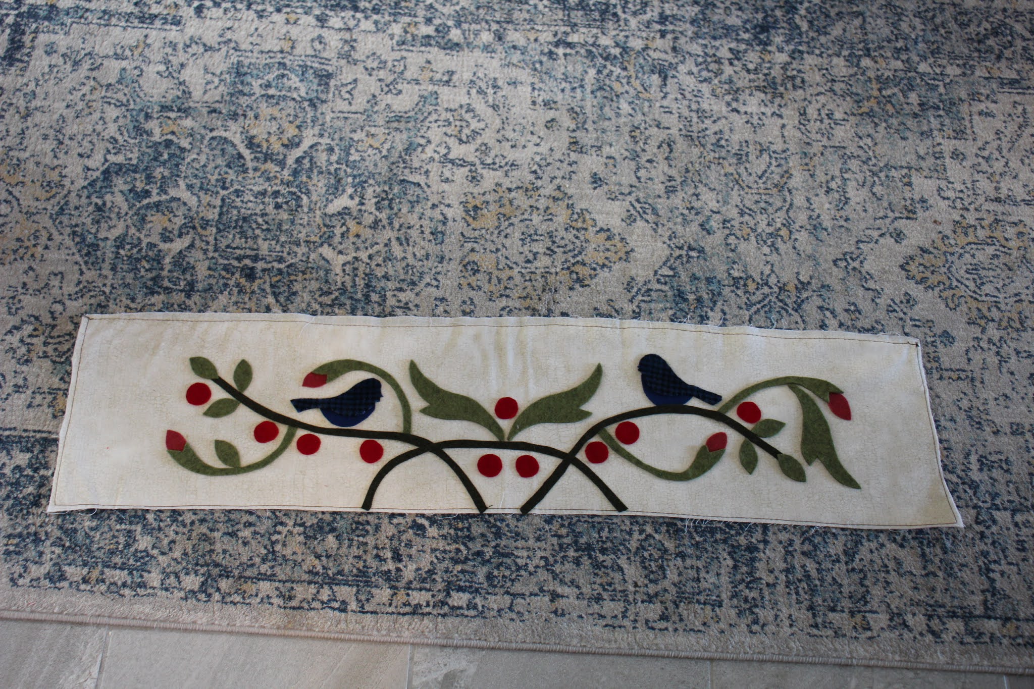 Time to finish the picture quilt for spring. I like Edta Sytar's applique for nature & movement that she creates in her design, so here's what I created from her design. Now should I use two red berries in the centre or -