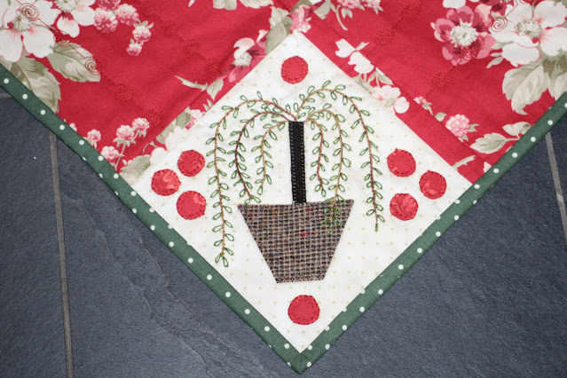 I changed out the cornerstones that were to be whimsical stars to my embroidered potted willows & I used up some of those red fabric dots around them!
