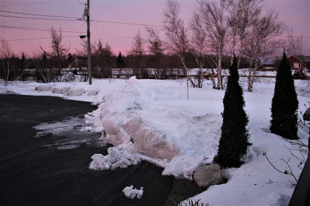 Looking through the dining room window at the deck railing that I use as my snow gauge, it is covered again by the strong winds that grow the snowdrifts.The asphalt was installed in the summer of 2017 & this year needs to be sealed again, that's going to be a big job! Remember the hot day that it went in Sandy & you gasped at the size of the area being done?